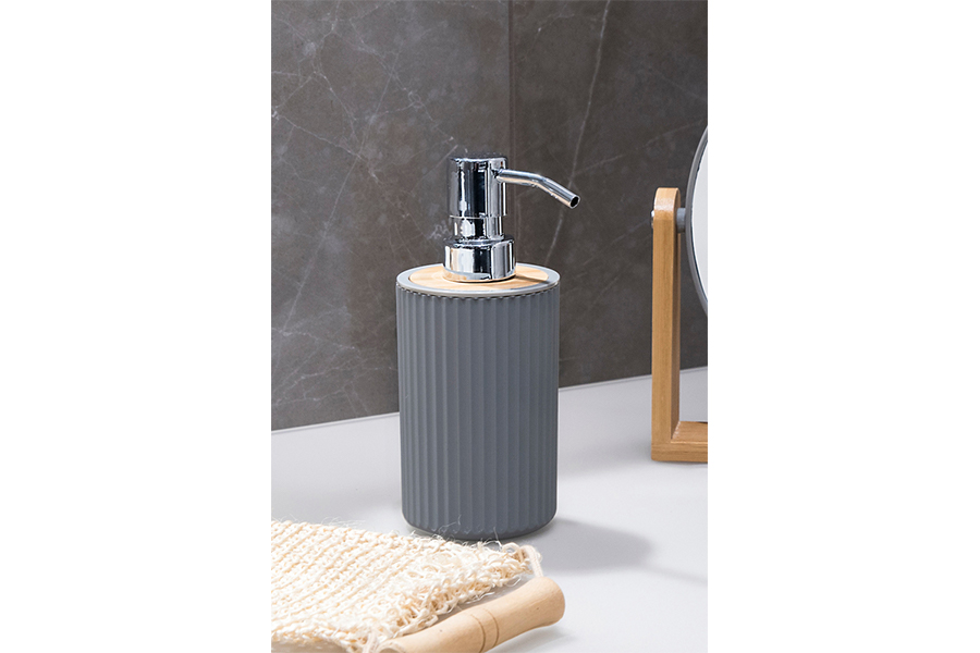 Dozator za tekući sapun je u mat pepeljasto sivoj boji. Odlikuje ga teksturirani dizajn s reljefnim okomitim crtama. Dozator s pumpicom izrađen je od prirodnog bambusa i ABS plastike, što mu daje elegantan prizvuk.