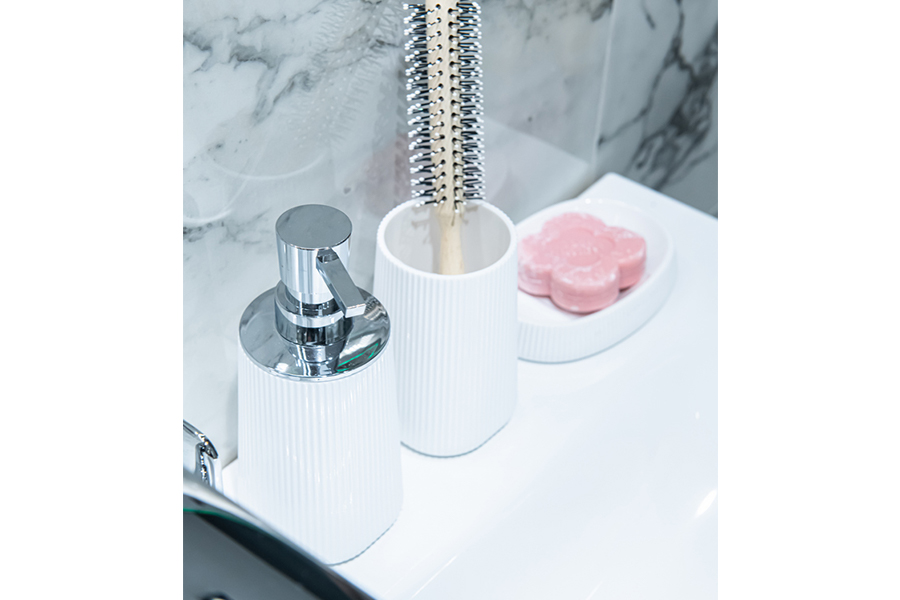 Dozator za tekući sapun u bijeli boji iz serije Zen predstavlja bit čiste forme i minimalizma. Njegova tekstura je iznimno praktična jer sprječava klizanje.