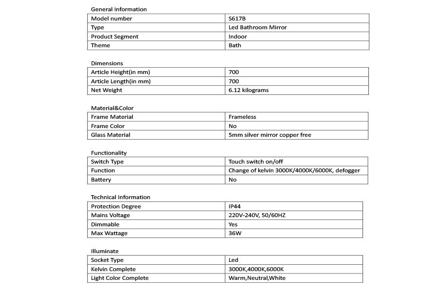 Kiara 70 Round LED Fog free - ima funkciju paljenja i gašenja LED rasvjete, s prekidačem na dodir, a također omogućuje podešavanje boje svjetla, od hladno bijele do tople bijele, te intenzitet svjetla - dimmer. Ogledalo ima i funkciju grijanja, što sprječava zamagljivanje ogledala. Stražnja strana ogledala je izrađena od aluminija i već je spremna za montažu na zid, a iz ogledala izlazi kabel za spajanje na električnu mrežu.