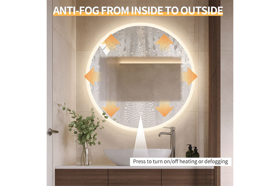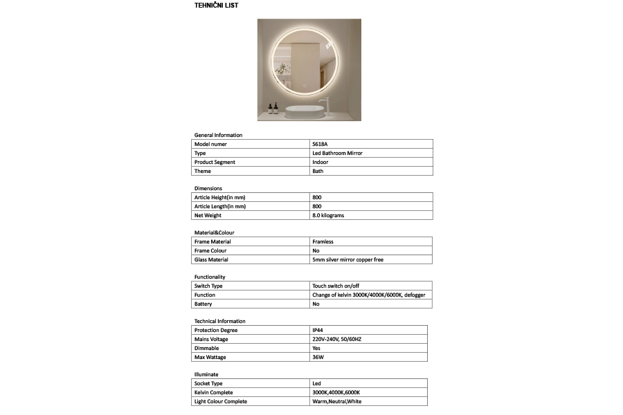 Kiara 80 Round LED Plus - ima funkciju paljenja i gašenja LED rasvjete, s prekidačem na dodir, a također omogućuje podešavanje boje svjetla, od hladno bijele do tople bijele, te intenzitet svjetla - dimmer. Ogledalo ima i funkciju grijanja, što sprječava zamagljivanje ogledala. Stražnja strana ogledala je izrađena od aluminija i već je spremna za montažu na zid, a iz ogledala izlazi kabel za spajanje na električnu mrežu.