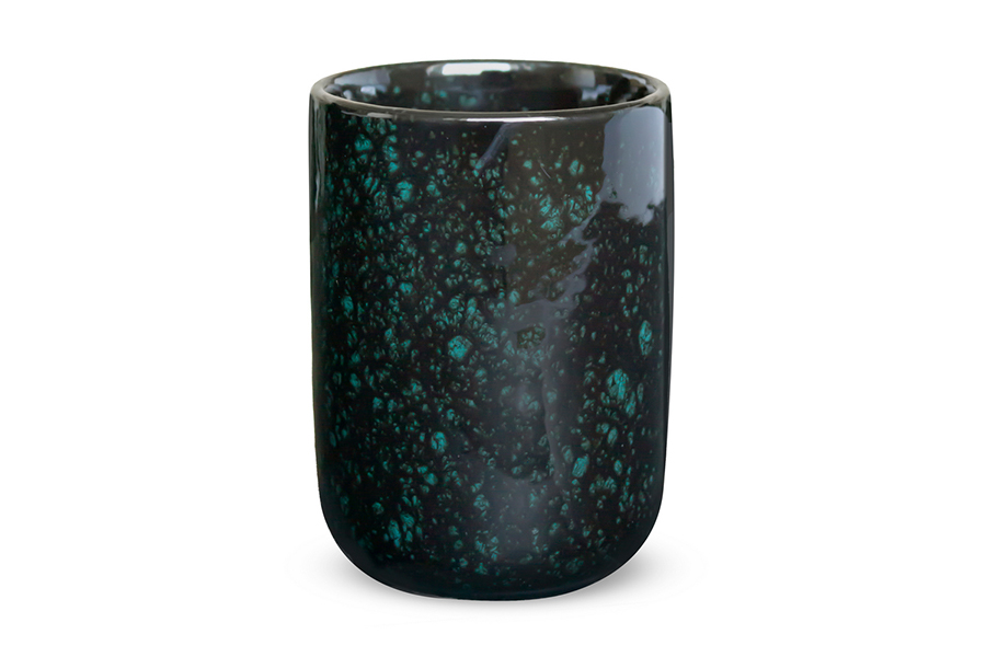 Čaša za zubne četkice izrađena je od elegantne crne kamenine i očarava svojom glatkom, lakiranom površinom. Ukrašena je nepravilnim zelenim točkicama.