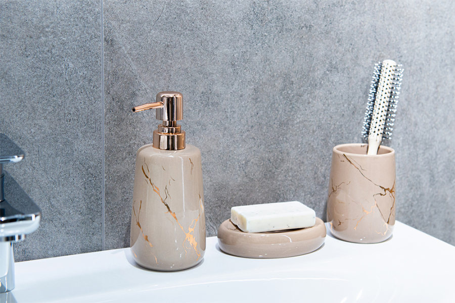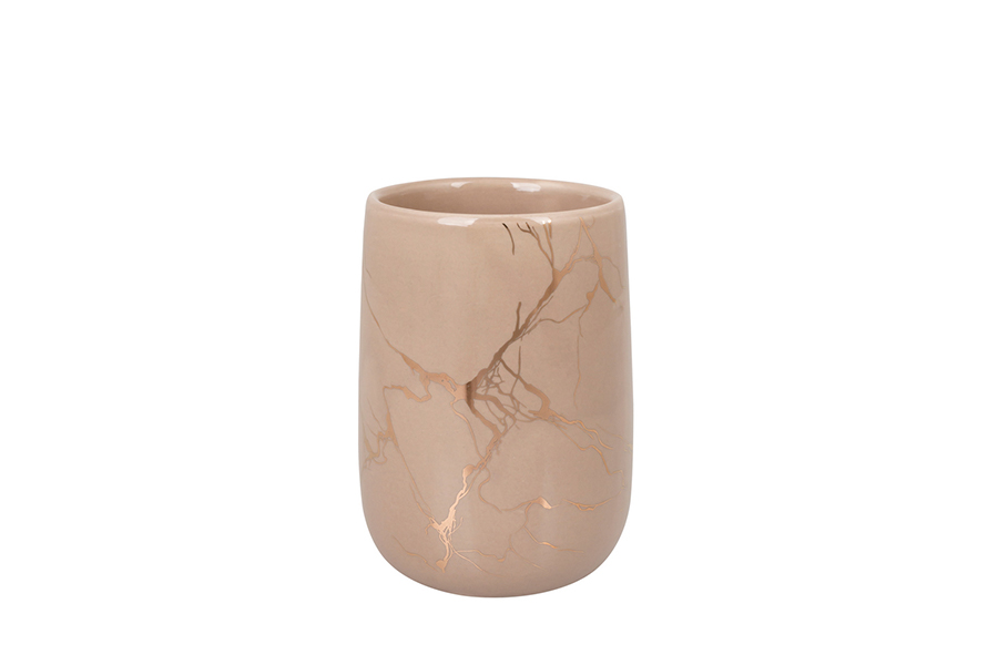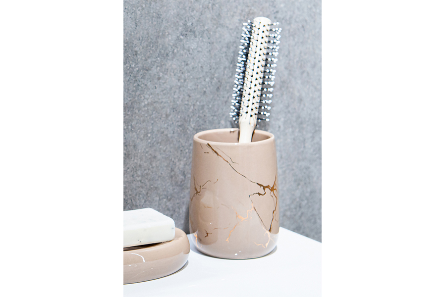 Čaša za zubne četkice izrađena je u modernoj ružičasto-zlatnoj boji. Može se koristiti za pohranu četkica za zube, paste ili čašice za vodicu za ispiranje usta. Odlično se pokazuje i kao posuda za šminku ili češalj za kosu.