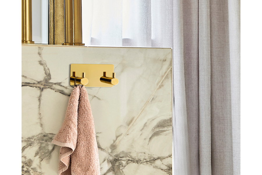 Dvostruka vješalica u sjajno zlatnoj boji spaja moderan dizajn i jednostavnu funkcionalnost. Izrađena je od obojenog čelika, a njezin elegantan izgled lijepo se uklapa u različite stilove interijera. Ugradnja pomoću samoljepljive trake je brza i jednostavna, bez potrebe za bušenjem, što je čini praktičnim i čistim rješenjem.