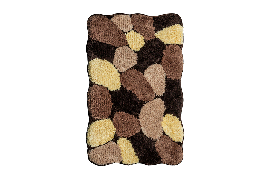 Ova kupaonička prostirka izrađena je od mekanih, pahuljastih mikrovlakana. Ima dekorativni uzorak smeđeg kamena. Stražnja strana od PVC-a je protuklizna i prostirka je pogodna za korištenje s podnim grijanjem. Može se prati u perilici rublja na 30 stupnjeva Celzija. Nemojte glačati, kemijski čistiti, izbjeljivati niti sušiti u sušilici rublja.