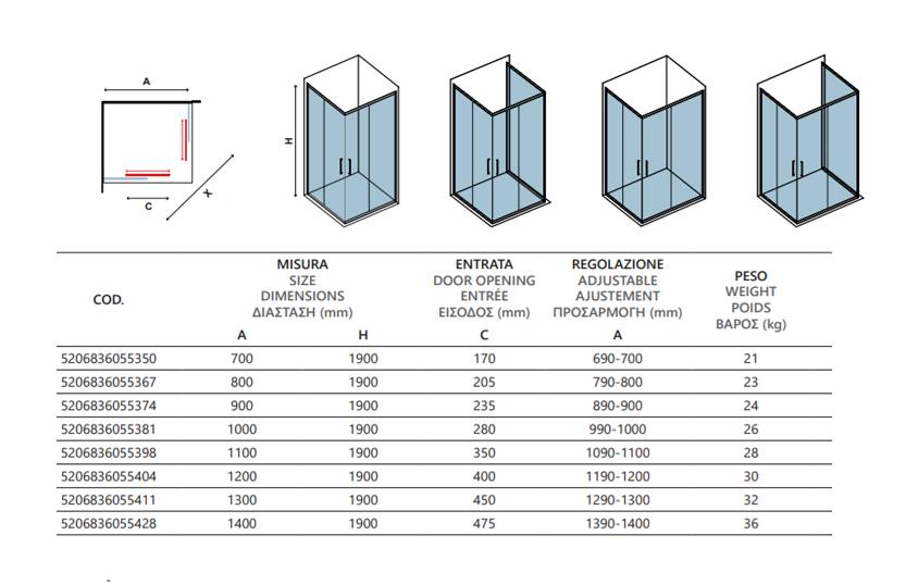 Dužina: 1000 mm, širina: 1000 mm, visina: 1900 mm.