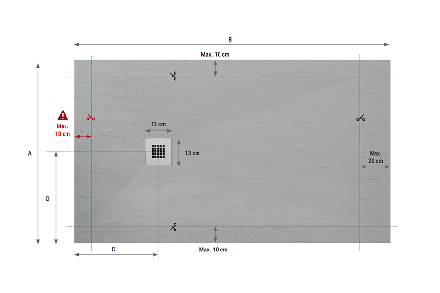 Važno: tuš kada od umjetnog kamena može se rezati - tako ćete dobiti svoju posebnu dimenziju nekoliko cm manju od navedene dimenzije. Upute za rezanje kade prikazane su na tehničkom crtežu. Na primjer, tuš kadu 80x140 možete dobiti izrezom 78x138 ili bilo koju drugu dimenziju koja vam je potrebna.